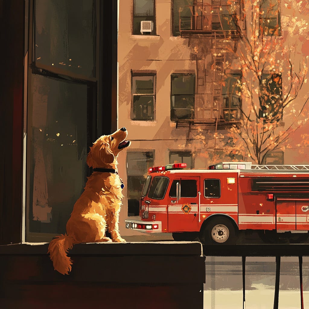 Whenever the fire truck sped down the street with its siren blaring, Oscar would tilt his head, his ears perking up. Then, with a howl as loud as he could manage, he would sing along with the siren, his voice a cheerful serenade to the brave firefighters inside. The firefighters, knowing Oscar well, always waved back, their faces lighting up with smiles