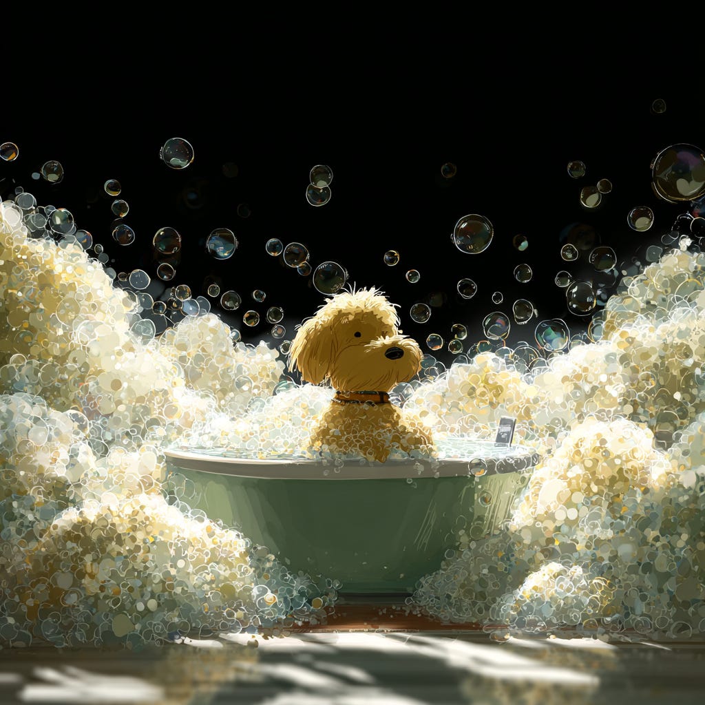 Alice's favorite time of the week was when her owner, Dr. Daisy would give her an elaborate bubble bath. Dr. Daisy was an artist, and she had a knack for making everyday moments magical. She would gather all her supplies: fancy scrubbers, colorful bath toys, and the most delightful-smelling soap that filled the room with the scent of blooming flowers.