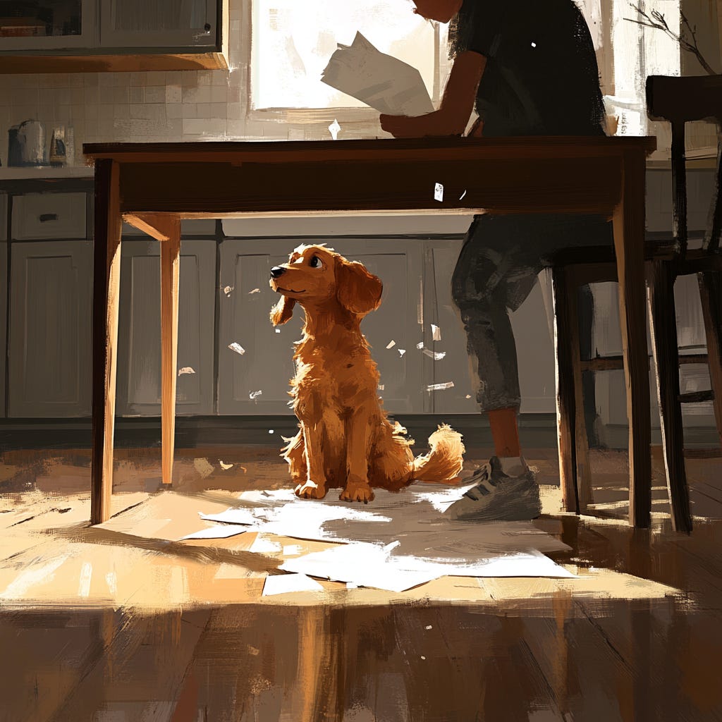 “Benny!” Max exclaimed, jumping out from his hiding spot. Benny looked up, his mouth full of paper, and wagged his tail innocently.