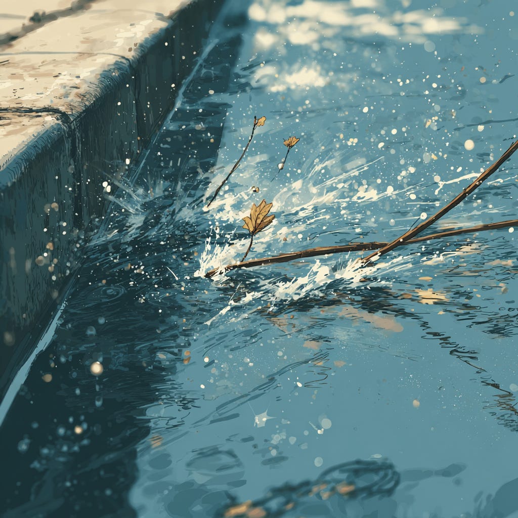 They placed their sticks in the water and watched as the makeshift boats sailed down the rushing gutter stream. The water carried the boats swiftly, and the poodles ran alongside, cheering and laughing.