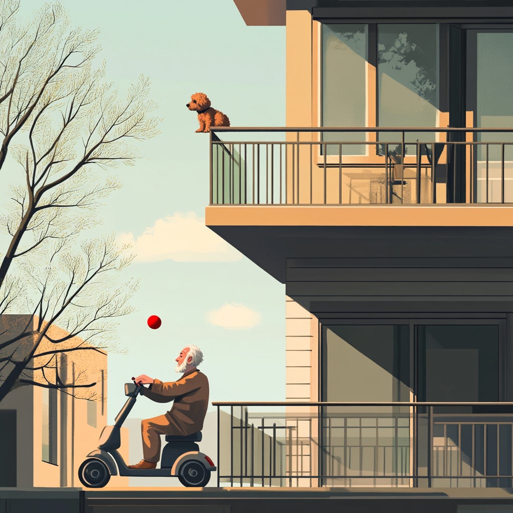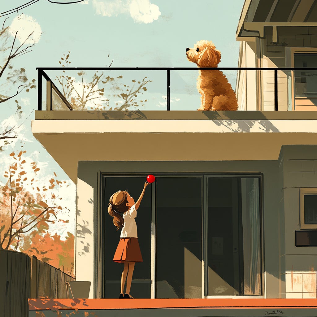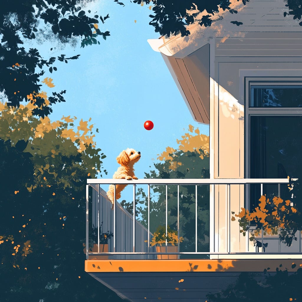 You see, Hampson lived on the second floor of a charming house, with a balcony overlooking the bustling street below. Every morning, as people walked by, Hampson would drop his favorite bright red ball off the balcony. The ball would bounce and roll, catching the attention of anyone passing by