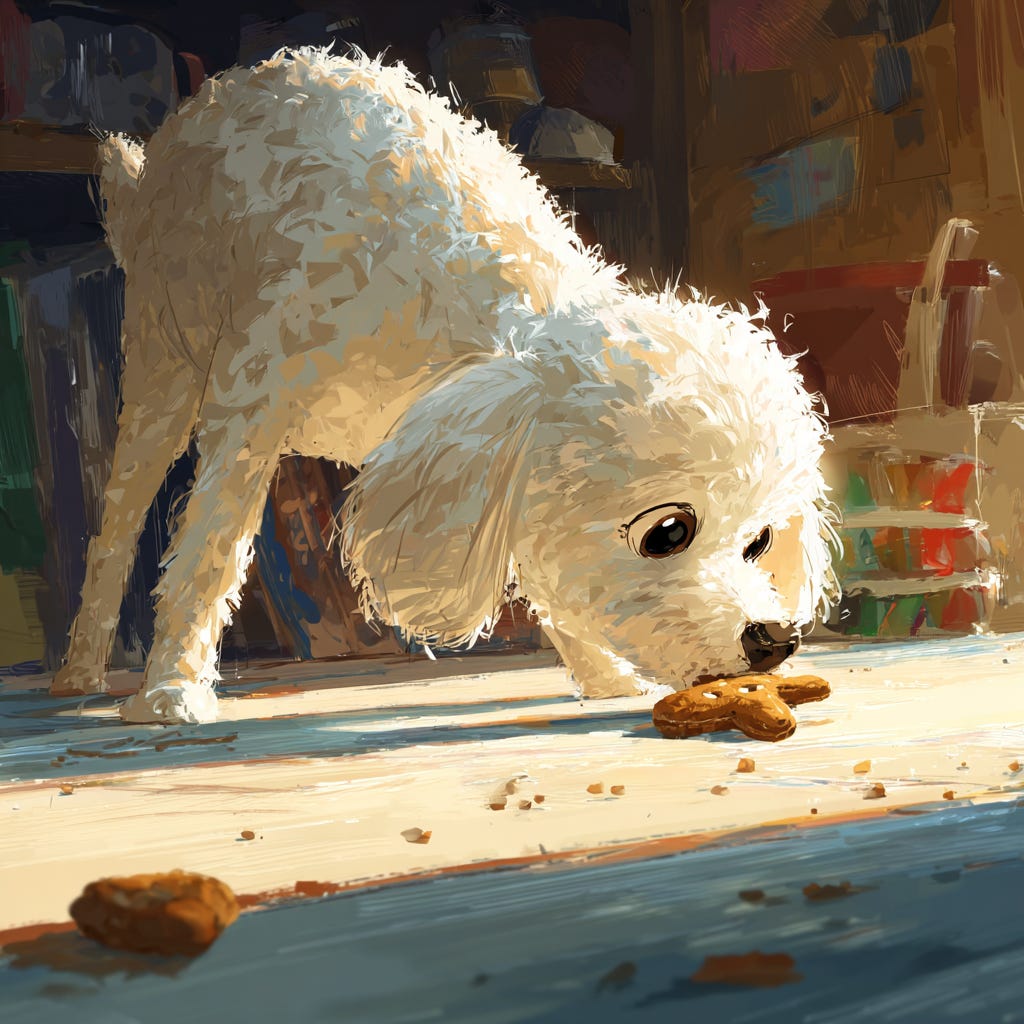 She turned and found Hillary happily nibbling on a cookie that had fallen to the floor. Her ears perked up, and she gave Emma an innocent look—as if to say, “Who, me?