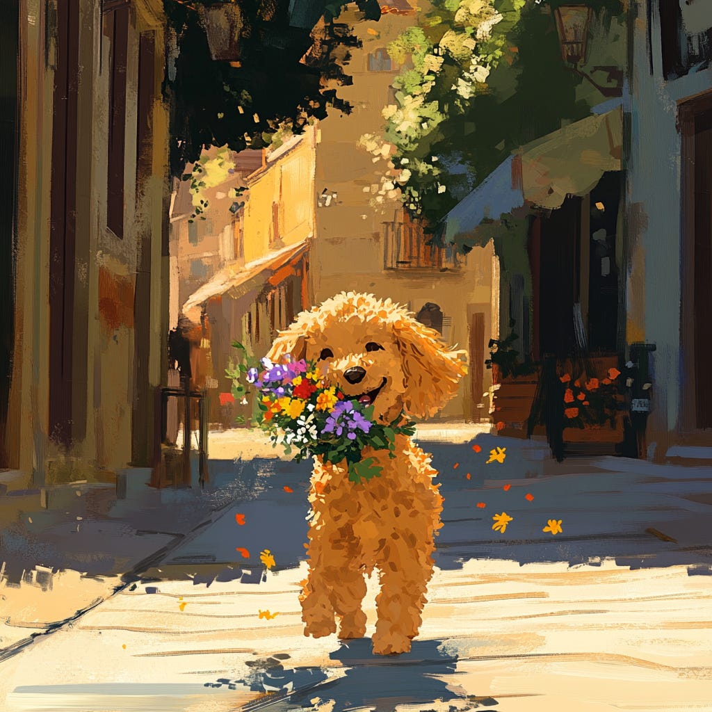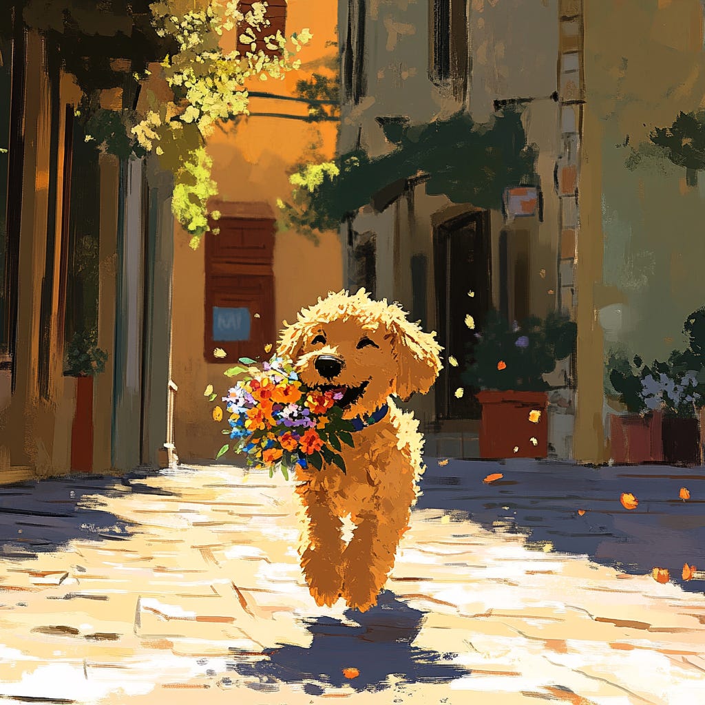 One sunny morning, Toby woke up with a grand idea. He wanted to thank all the wonderful "mothers" in his life by bringing each of them a beautiful flower. Toby was a thoughtful pup and knew just the right flower for each of his favorite ladies.